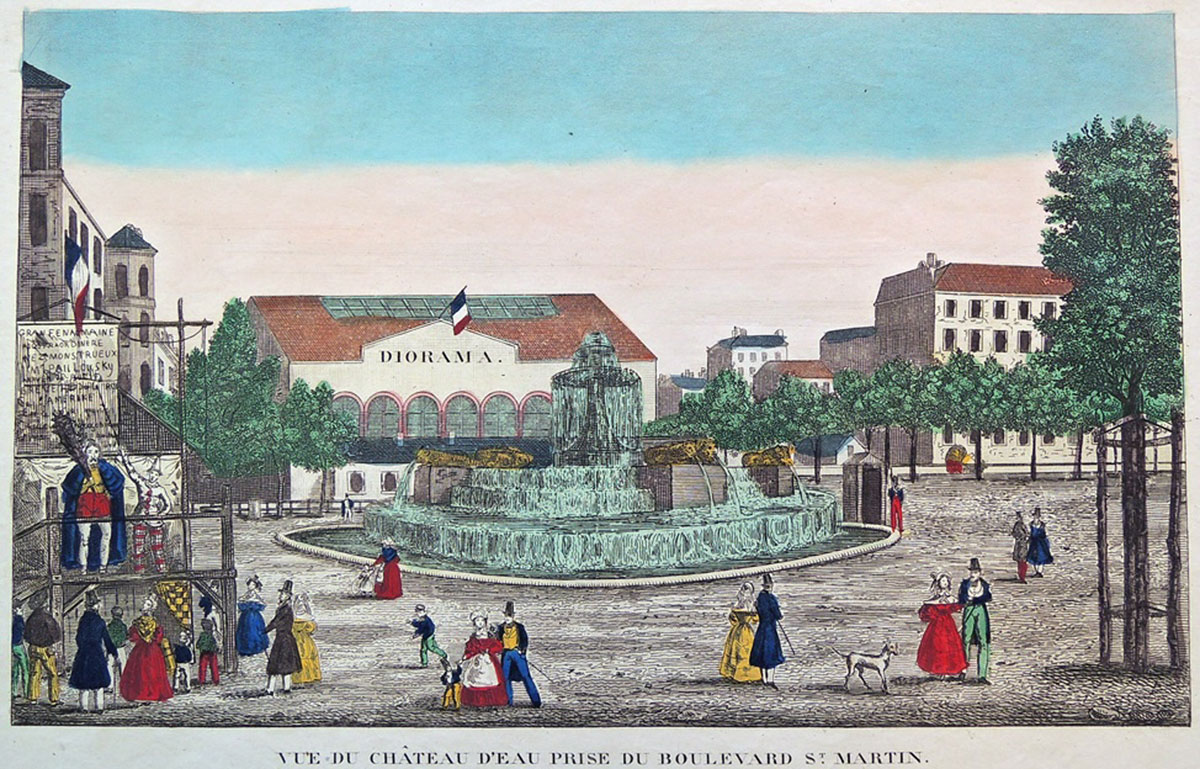 The diorama’s capacity to stage human-environmental relations was part of the form from its earliest incarnation. The technology was patented in 1822 by Louis Daguerre and Charles Bouton. Daguerre is much better known for having invented that other useful illusion, the daguerreotype, and the diorama is often understood in relation to the histories of photography and cinema.4 Drawing on his prior career as a designer of stage sets, Daguerre intended the diorama as a durational performance in a purpose-built structure. The two artists set up shop on the rue Sanson in Paris and charged three francs for a thirty-minute viewing. Paintings were animated by lighting, movement, and the occasional live animal. Subjects ranged from the harbour at Brest to the Temple of Solomon, with most showings featuring one interior and one landscape view. Generally, Bouton painted the interiors and Daguerre the landscapes. Illustrations of the diorama structure highlight the building’s many windows allowing for abundant natural light, the well-dressed crowd in attendance, and the location in a neighbourhood known for entertainment (Fig. 1).