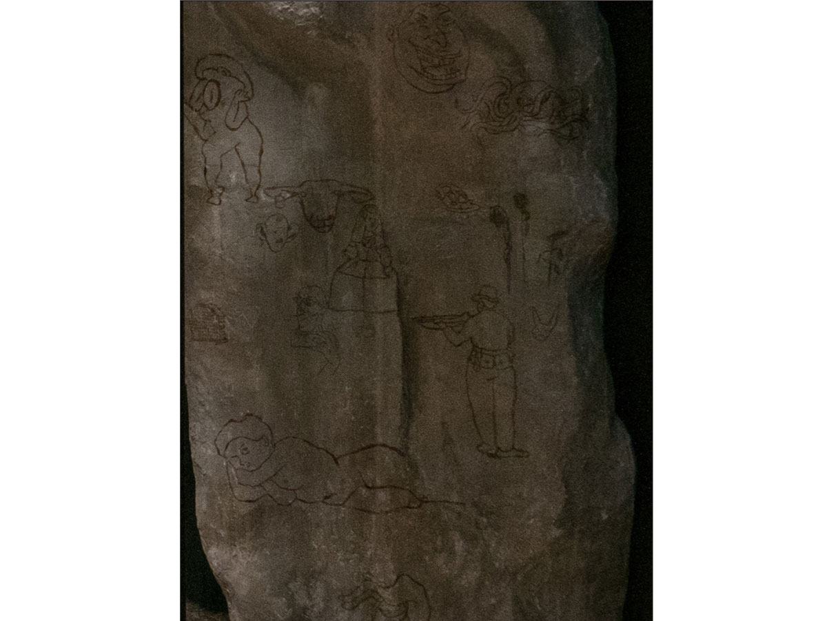 The limits of representation are a leitmotif of Malingrëy’s painting. The figures in the first vitrine are surrounded by an array of sketches and drawn plans, though the images seem to have little correspondence with their actions. In the third vitrine, elements pulled from the history of art are scratched into the cave walls like graffiti (Fig. 10). We see recognizable bits of Goya, Manet, Matisse, and other classics from the art historical canon. The infanta from Velázquez’s Las Meninas appears too, reminding us of a long history of asking what representation means for the beholder.