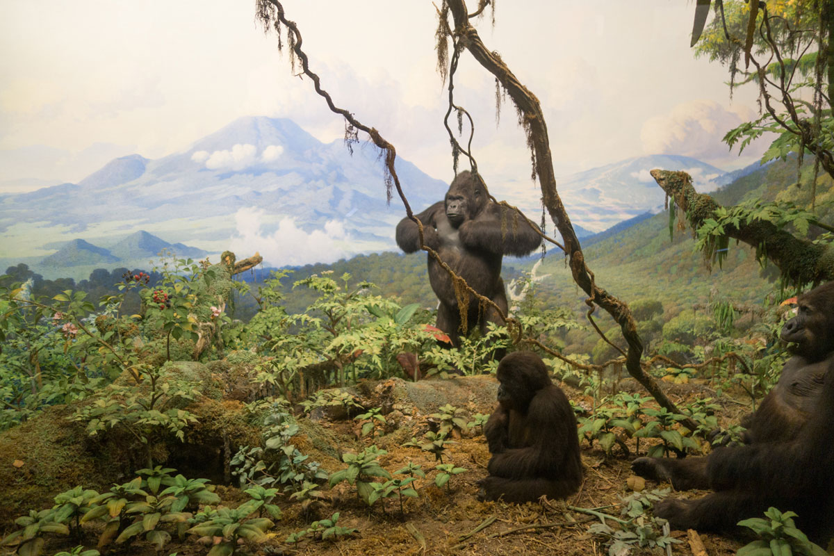 Habitat dioramas were developed in the United States by the taxidermist Carl Akeley.21 Akeley pioneered an innovative form of taxidermy, draping skins over sculpturally carved forms rather than stuffing them with sawdust. The result was to make the dead animals look more alive. He expanded these uncanny associations still further by arranging the animals in picturesque settings: in a muskrat group Akeley arranged for the Milwaukee Public Museum in 1889, arguably the first habitat diorama, the animals are put in dialogue with one another and their environment, including a painted landscape background, elements of foliage and brush, and the illusion of a pond. Some of the best known and spectacular examples of the genre appeared under Akeley’s tenure at the American Museum of Natural History (AMNH) in New York City, notably in the Hall of African Mammals. Twenty-eight dioramas feature lions, gorillas, giraffes, mountain nyalas, bongos, and more, set in panoramic landscapes and accessorized with plants, grasses, and elements of the natural world collected and brought back from Africa by a team of artists and scientists. Often featuring endangered species, the dioramas were nominally concerned with conservation.