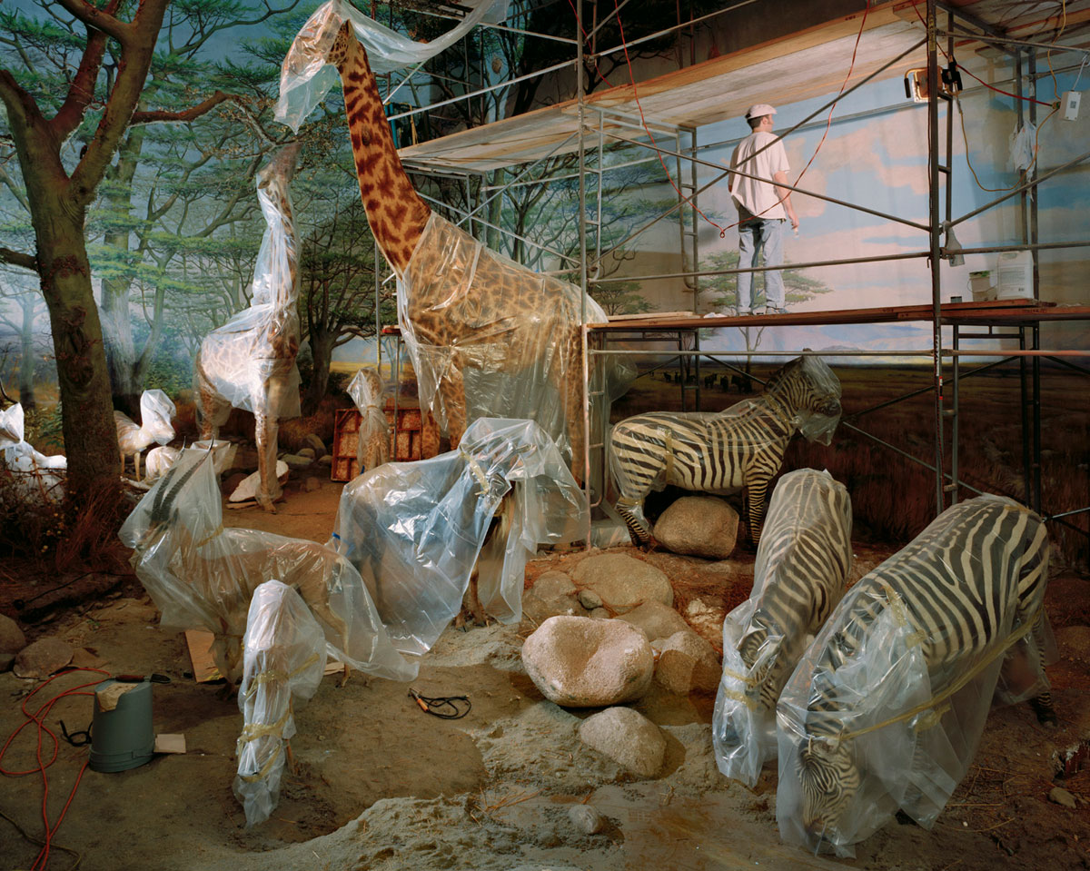 Rather than augmenting the deception of the diorama, photographer Richard Barnes chooses to puncture its illusions and remind us of the falseness of its constructs. In his series Animal Logic, Barnes backs away from the diorama’s framed view to reveal the labour of its maintenance. In one, a man comes face to face with a stuffed buffalo as he vacuums dust off imitation snow; in another, taxidermy specimens are protected by plastic while a painter on scaffolding touches up the backdrop (Fig. 5). There is no hiding, in these images, that they are human-made and human-maintained, and there is a certain pleasure in this behind-the-scenes access. Yet Barnes simultaneously produces another illusion: that we are insiders, that we are in the know, that we are somehow beyond being ‘fooled’ by the dioramas’ tricks.