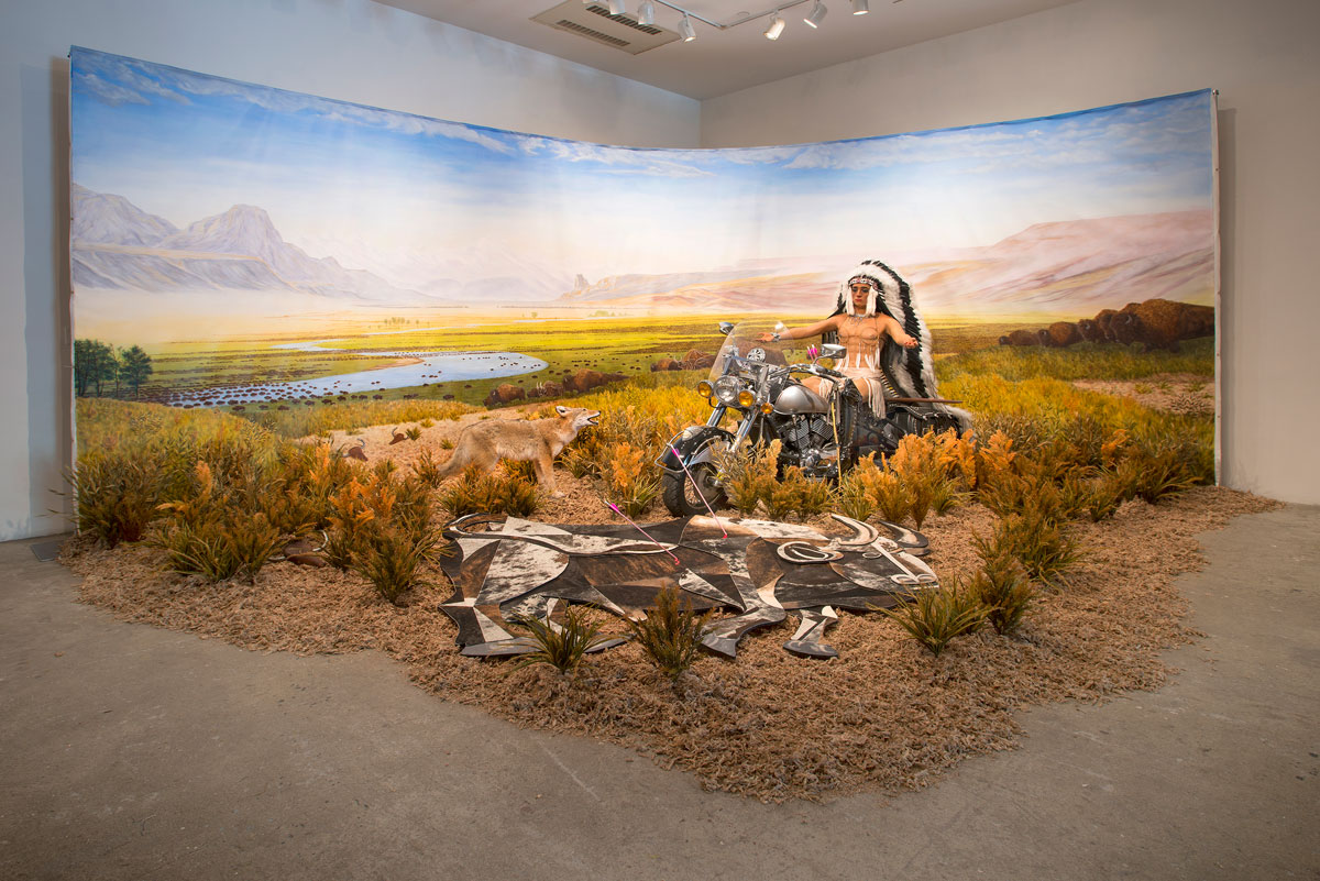 Kent Monkman takes a different tack, retaining the diorama and all of its evident falseness to confront uncomfortable realities concerning so-called ‘natural’ histories and who has the right to tell them. A Cree-Anglo-Irish artist, Monkman frequently reappropriates imagery and artworks that have historically been used to marginalize non-white peoples, inserting, for example, his alter ego Miss Chief Eagle Testikle in the place of George Washington in mistikôsiwak (Wooden Boat People): Resurgence of the People (2019). In Bête Noire (2014), Monkman directly addresses the ethnographic dioramas that have perpetuated stereotypes of Native American and First Nations peoples as ‘vanishing’ and in need of preservation (Fig. 6). The installation makes reference to a 1970 diorama depicting a buffalo hunt from the Manitoba Museum in Winnipeg.31 Instead of that scene’s timeless rendering of a Metis hunter on horseback, Monkman’s Miss Chief sits atop a gleaming chrome motorcycle. Her make-up, painted nails, and thigh-high lace-up leather boots defy expectations for the sober world of the natural history museum. Miss Chief’s feathered bra is comprised of dreamcatchers, a cheeky reference to popular culture appropriations of First Nations’ material culture. Monkman further assembles distinct representational strategies within the same installation: the slain bull at Miss Chief’s feet is not a taxidermy specimen but instead rendered on cardboard in a cubist idiom, its body faceted in the manner of Picasso. The setting remains a vast, panoramic plain, in the style of Albert Bierstadt.