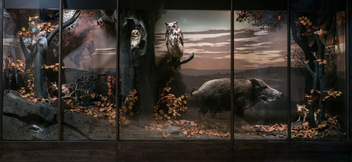 While the accompanying informative texts make some pedagogical reference to the loss of biodiversity and rising temperatures that increasingly characterize our epoch, the windows do not tell a clear story, nor do they have a strong message concerning the nature of the Anthropocene. Yet read alongside the history of the diorama as a form and in the specific context of the Musée de la Chasse et de la Nature, the Anthropocene diorama can help us to understand what it is to live in a world in which our illusions of control are harder to hold onto. The installation mimics the habitat diorama without retaining its ideological scaffolding; it allows the death and disaster so carefully curated out of those earlier installations to reappear. The certainty that humans are in charge has been replaced by a deliberate confusion as to what is organizing the view.